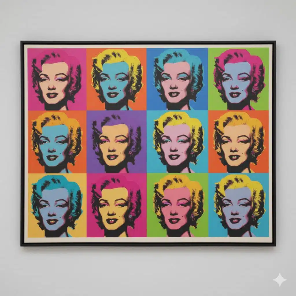 Ne surcharge pas le mur.Une Marilyn Warhol attire immédiatement le regard. Elle fonctionne comme un centre visuel.